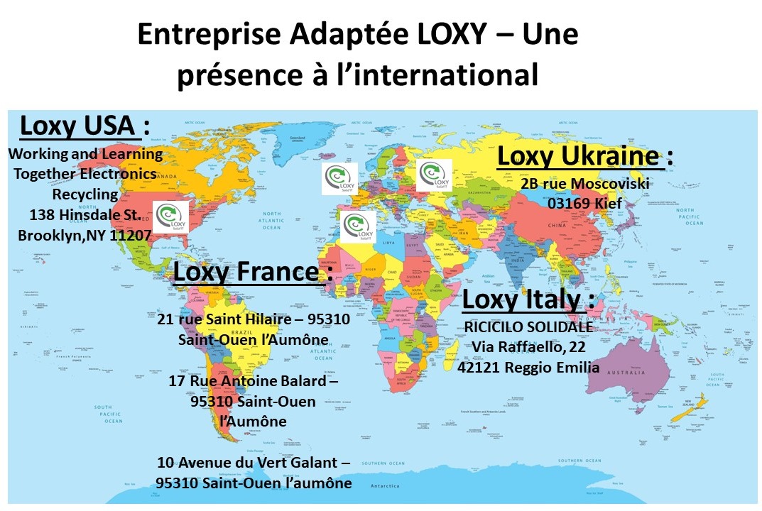 LOXY est une Entreprise Adaptée spécialisée dans la collecte et le recyclage informatique, à ce titre nos prestations sont déductibles des impôts. Notre objectif étant de promouvoir l'ensemble de nos personnels en leur apprenant un métier, des valeurs et un esprit d'équipe. Le coeur de métier de notre Entreprise Adaptée permet un recyclage propre d'environ quatre cents tonnes de déchets électriques par mois. Evitant ainsi pollution et gaspillage d'énergie. Tout cela sous couvert d'une forte politique sociale afin que l'équipe avance ensemble, nous recherchons, la réussite globale de l'entreprise et de ses salariés tout en préservant notre patrimoine.